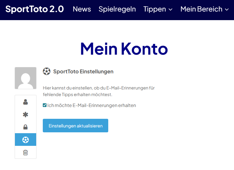 Falls Ihr diese wünscht müsst Ihr unter dem Menü “Mein Bereich” – “Mein Konto”, klicke links auf das Fussball Icon und setze das Häkchen um die E-Mail Erinnerung zu aktivieren.